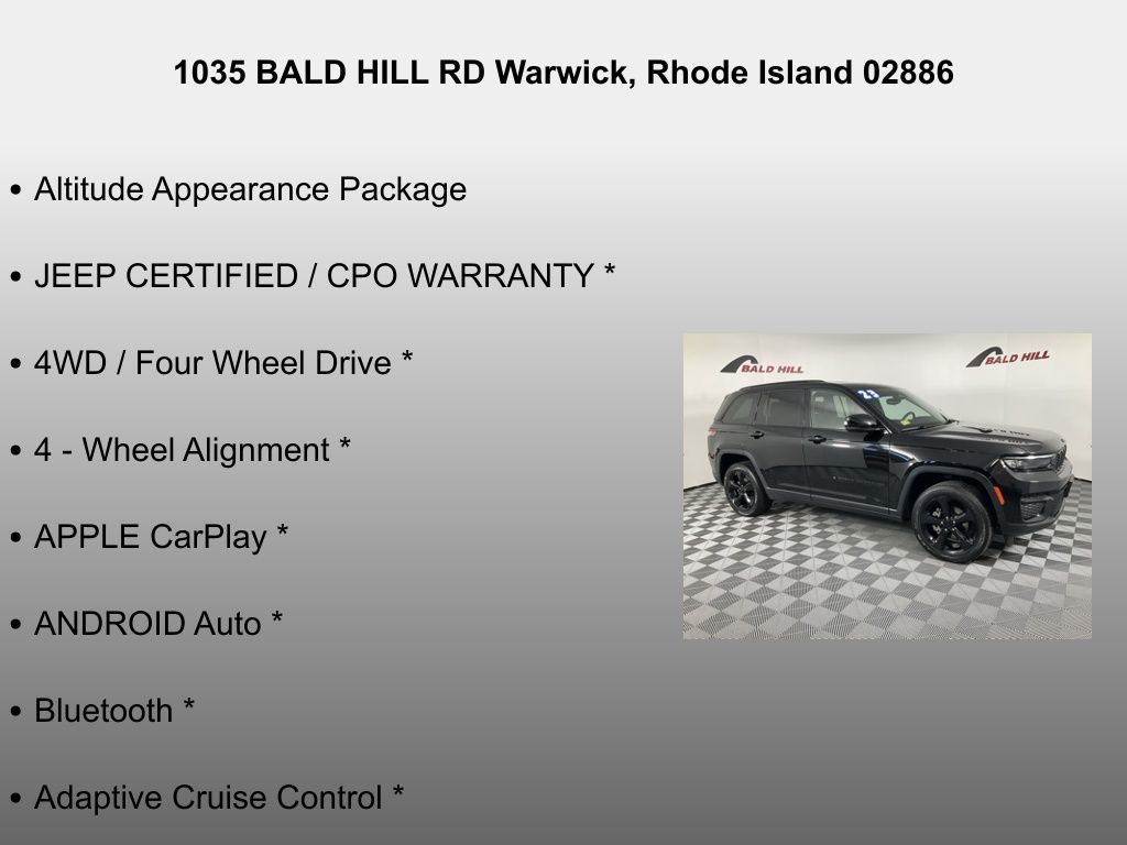 Backed by Jeep's renowned reputation for quality and reliability, this 2023 Grand Cherokee Altitude is a testament to the brand's commitment to excellence. Experience the difference for yourself and schedule a test drive today. We're confident that this exceptional SUV will exceed your expectations and provide you with the driving experience you deserve.